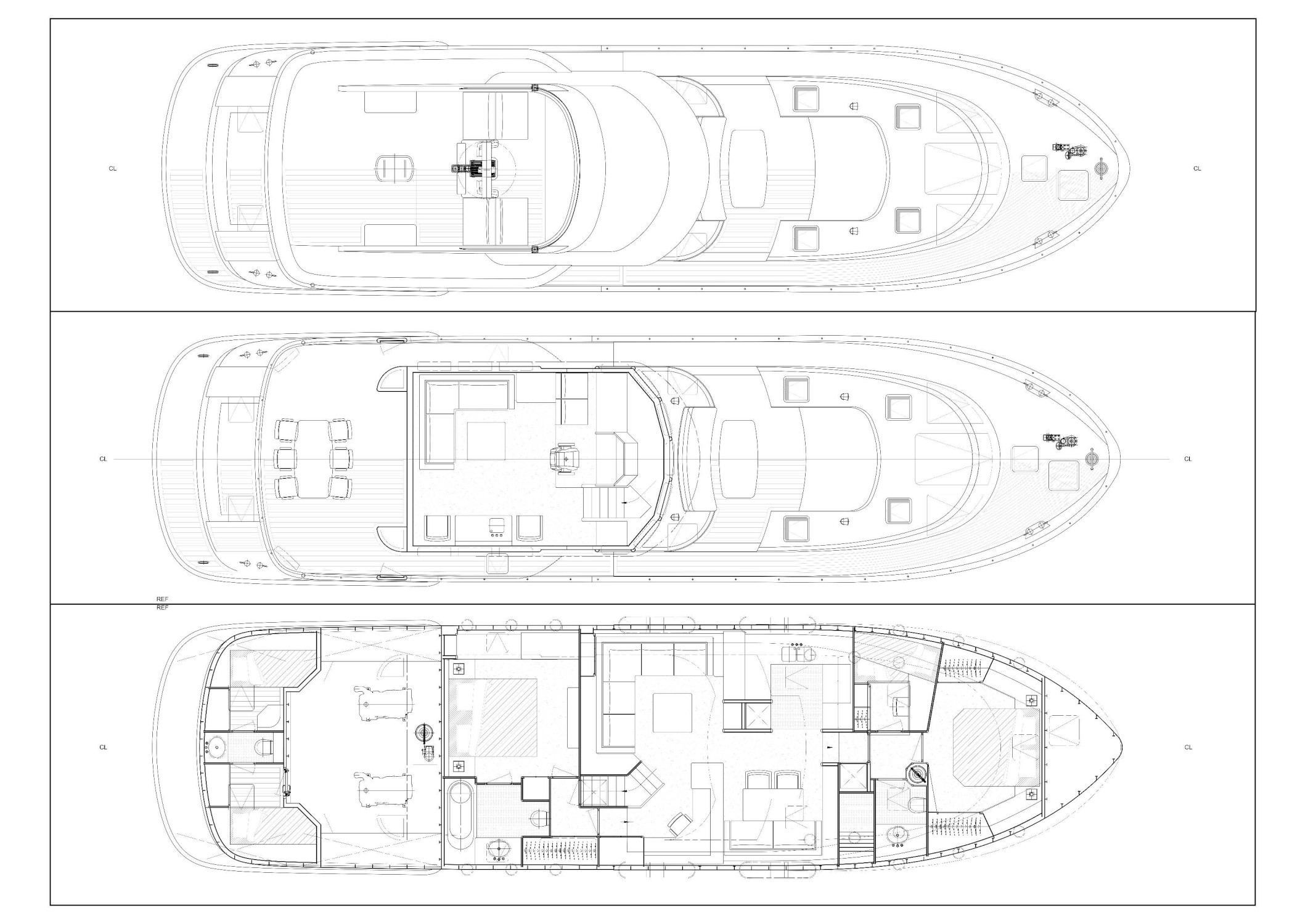 De Delfino Grand Voyager 74 heeft een standaard cabinelay-out met 5 hutten: 1 mastercabine, 2 gastcabines en 2 hutten voor crew of extra gasten. Ook onder het dek bevindt zich de kombuis, met een eettafel met banken en stoelen, een zithoek en een ruim bureau. Bovendek biedt een groot stuurhuis voor 9 personen plus de kapitein.